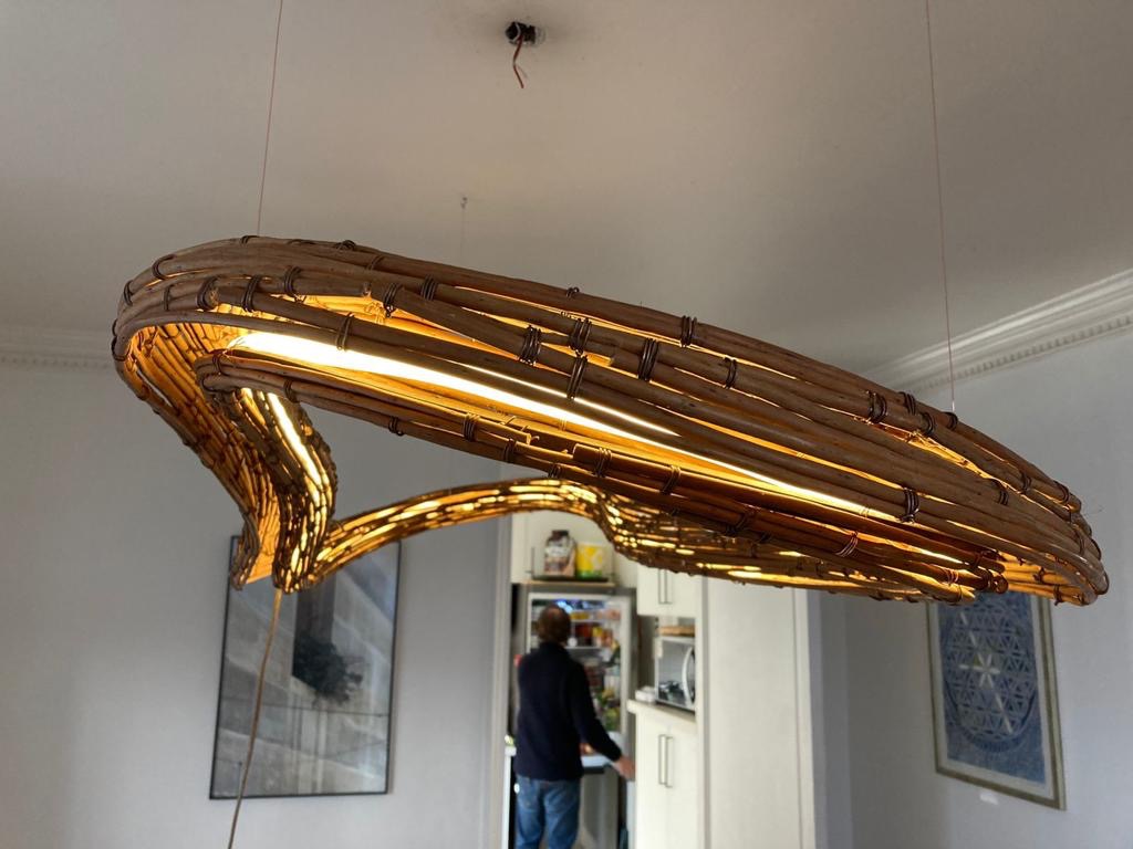 Esta lámpara de mimbre y alambre de cobre proyecta la luz a través de sus fibras tejidas. Su estructura curva encierra una cinta LED que ilumina con una delicadeza natural, evocando el fluir del río.
